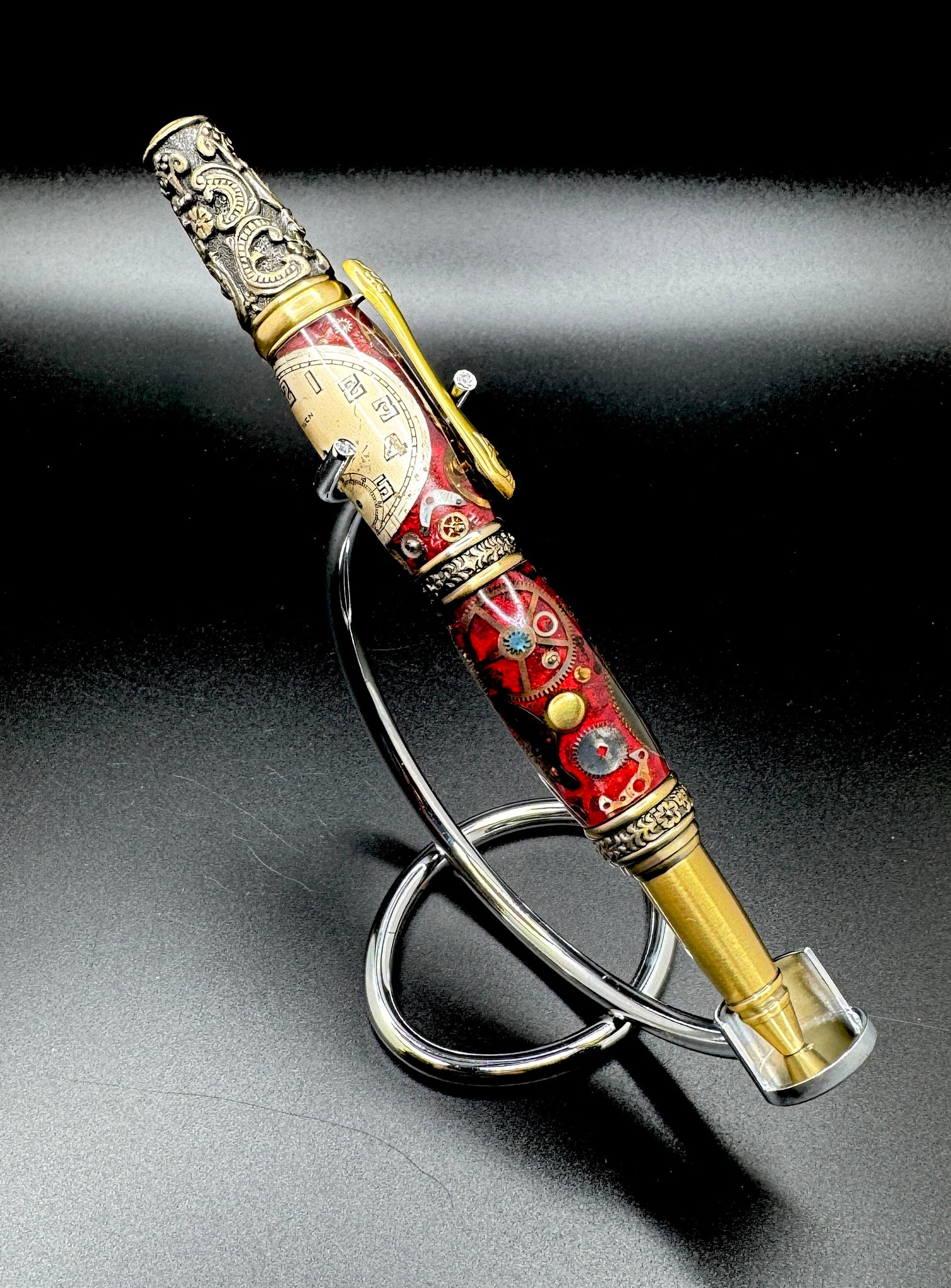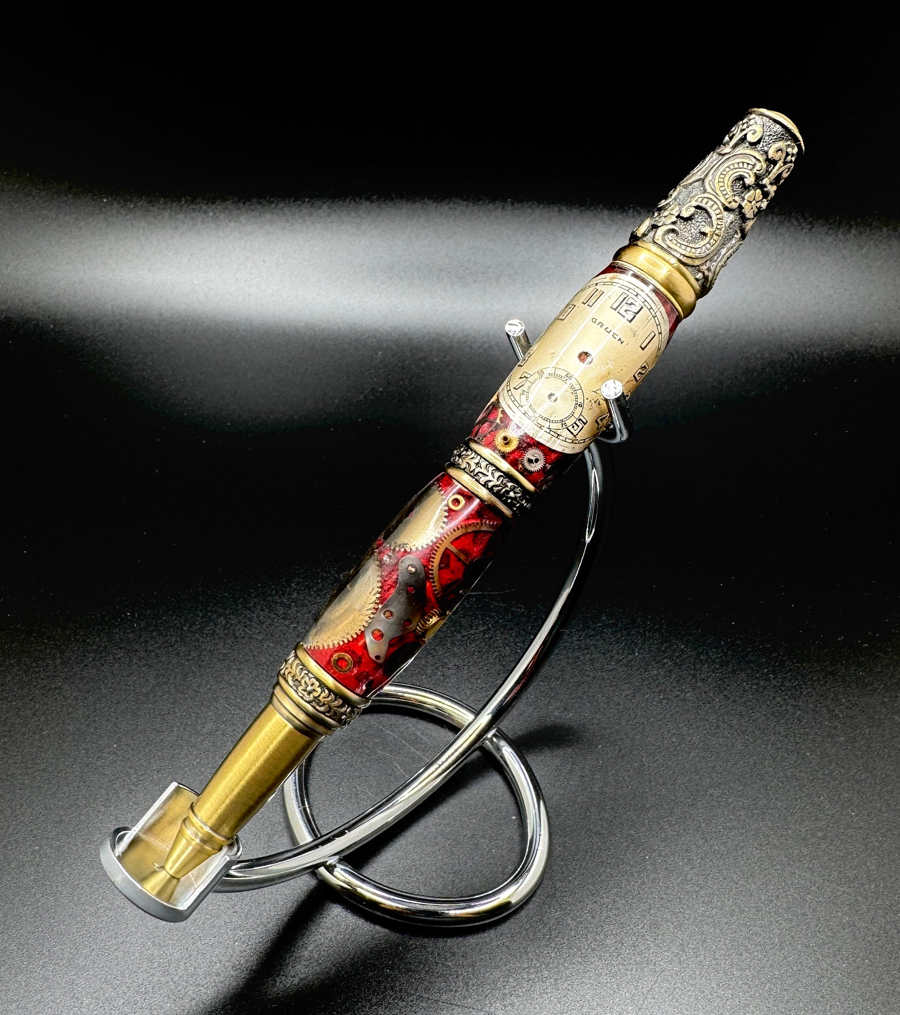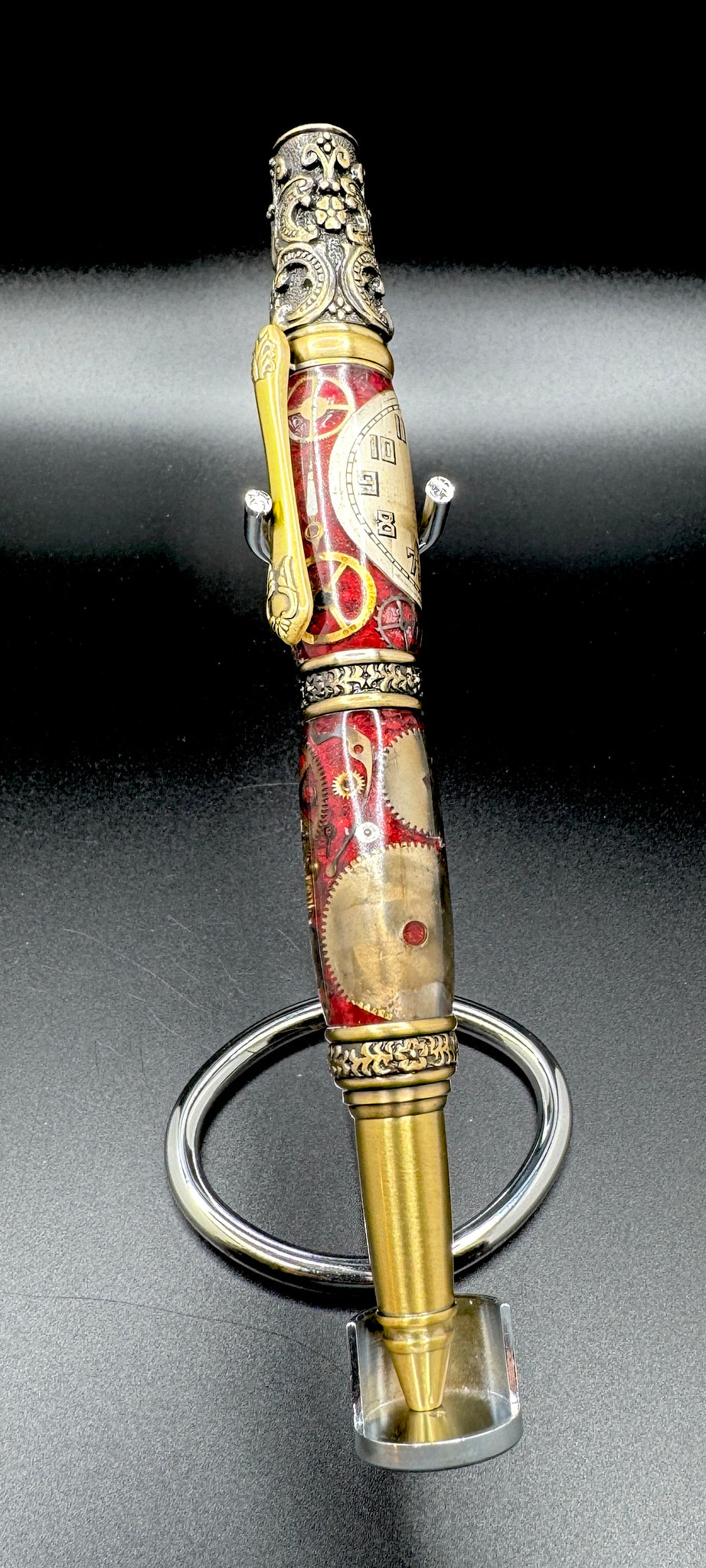 - Air brushed red background with watch parts encased in a polyester resin body.