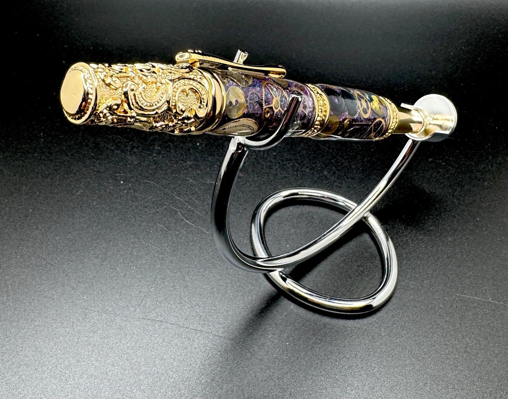 - Air brushed purple background with watch parts encased in a polyester resin body.