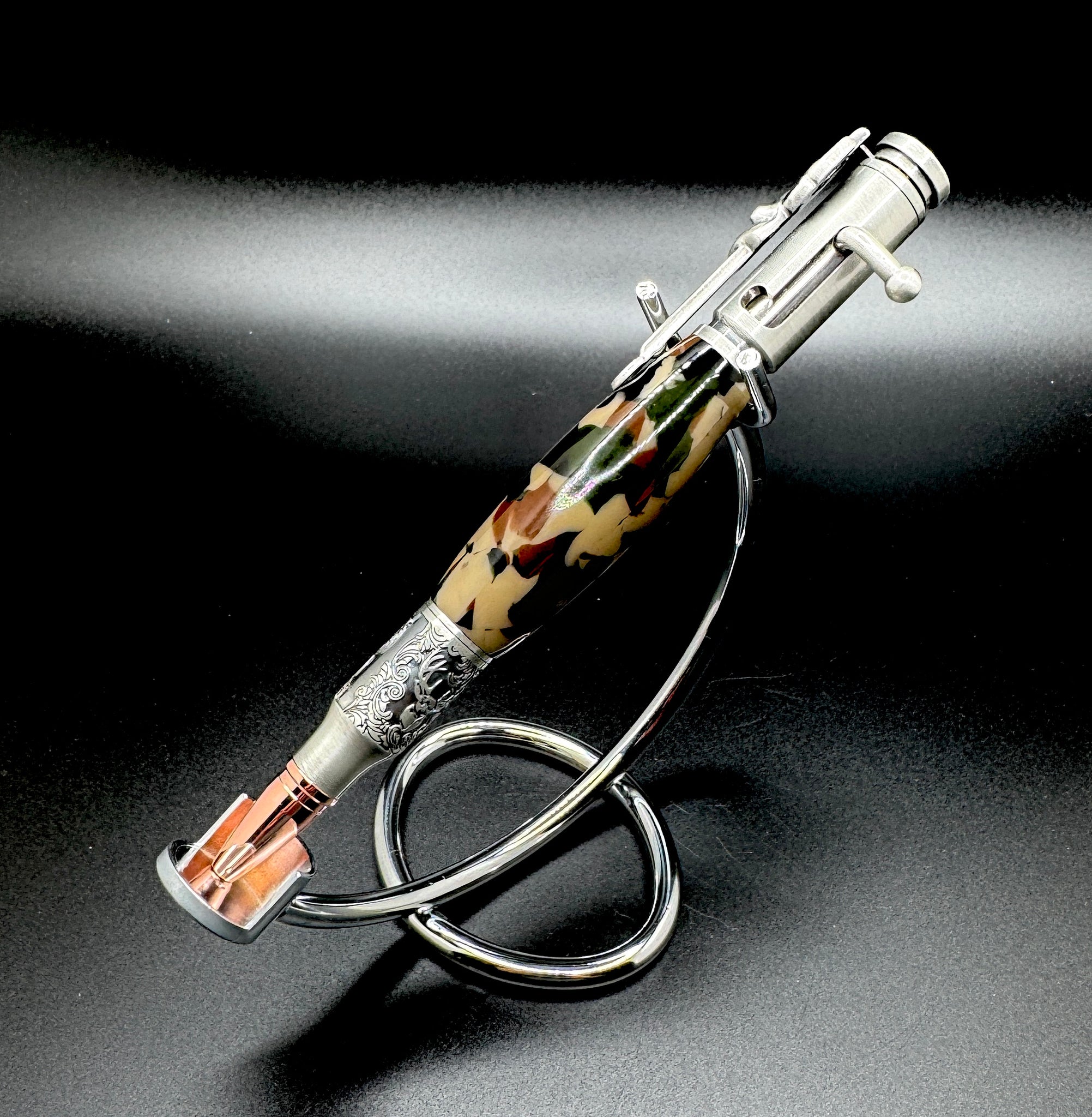 - The design emulates the type of engraved game scene scrollwork found on real and highly sought after bolt-action rifles.