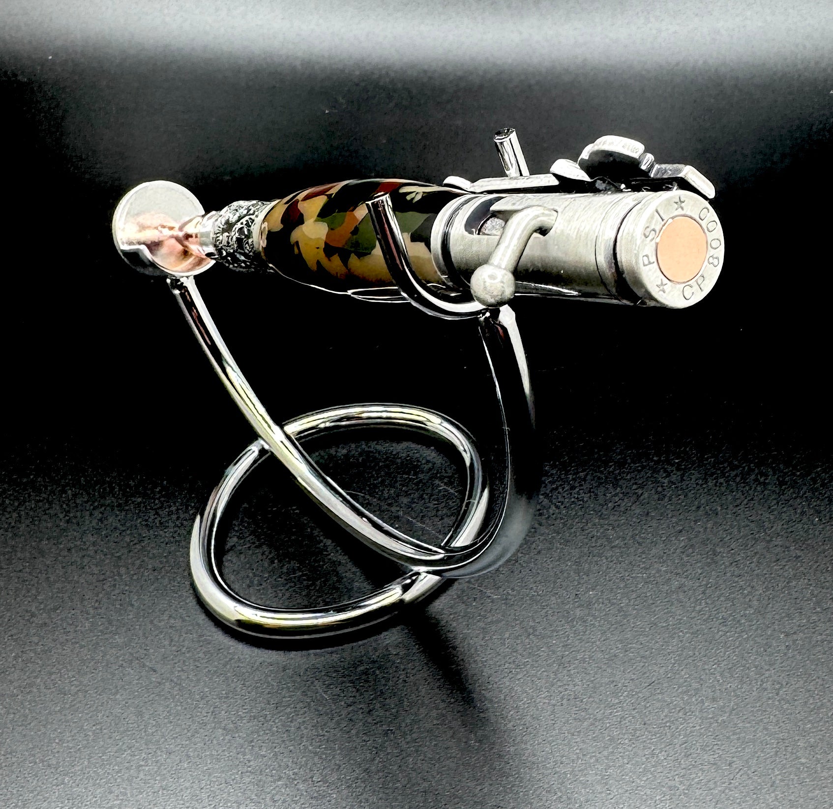 Pen tip features a relief cut scroll engraving of an authentic trophy deer mount.