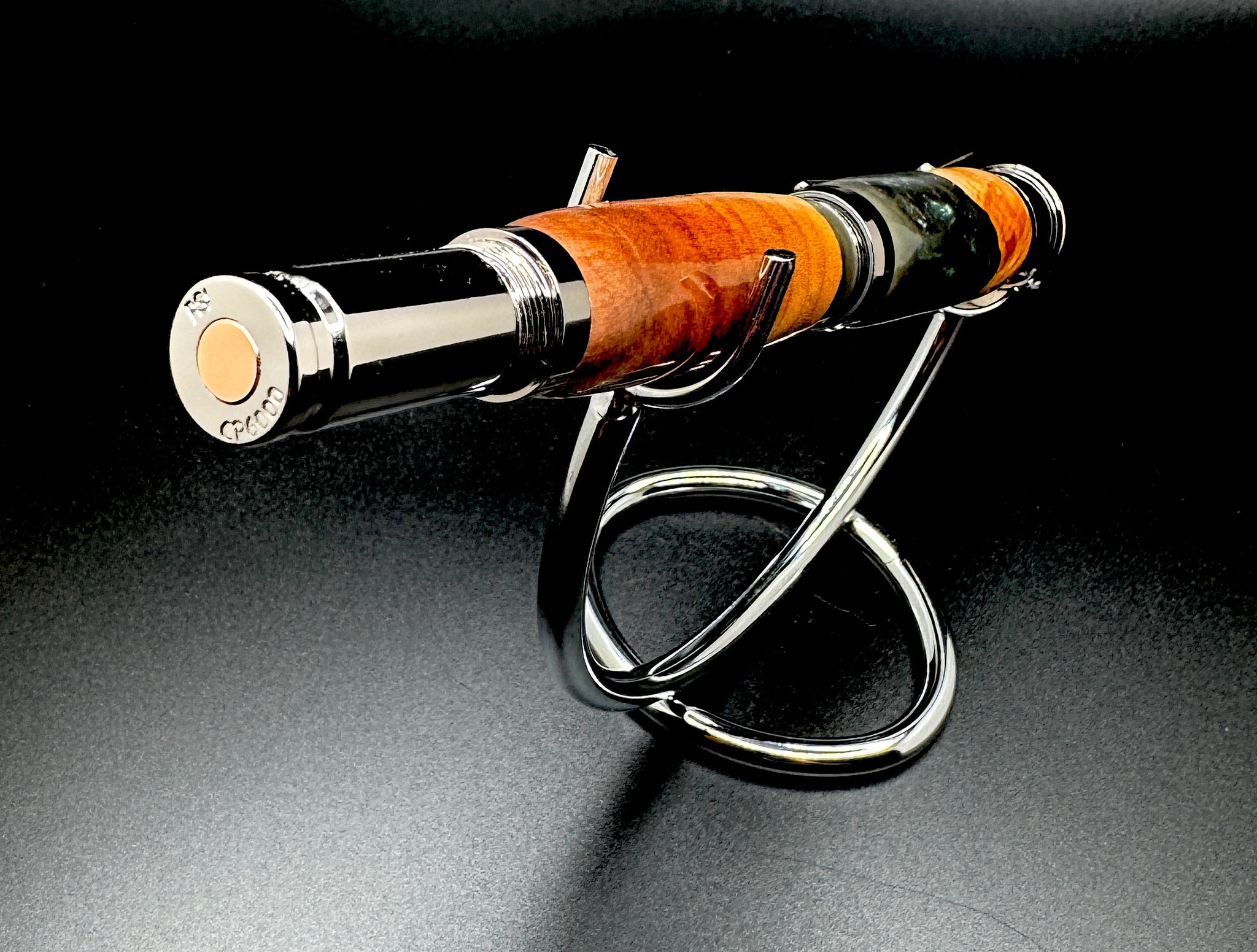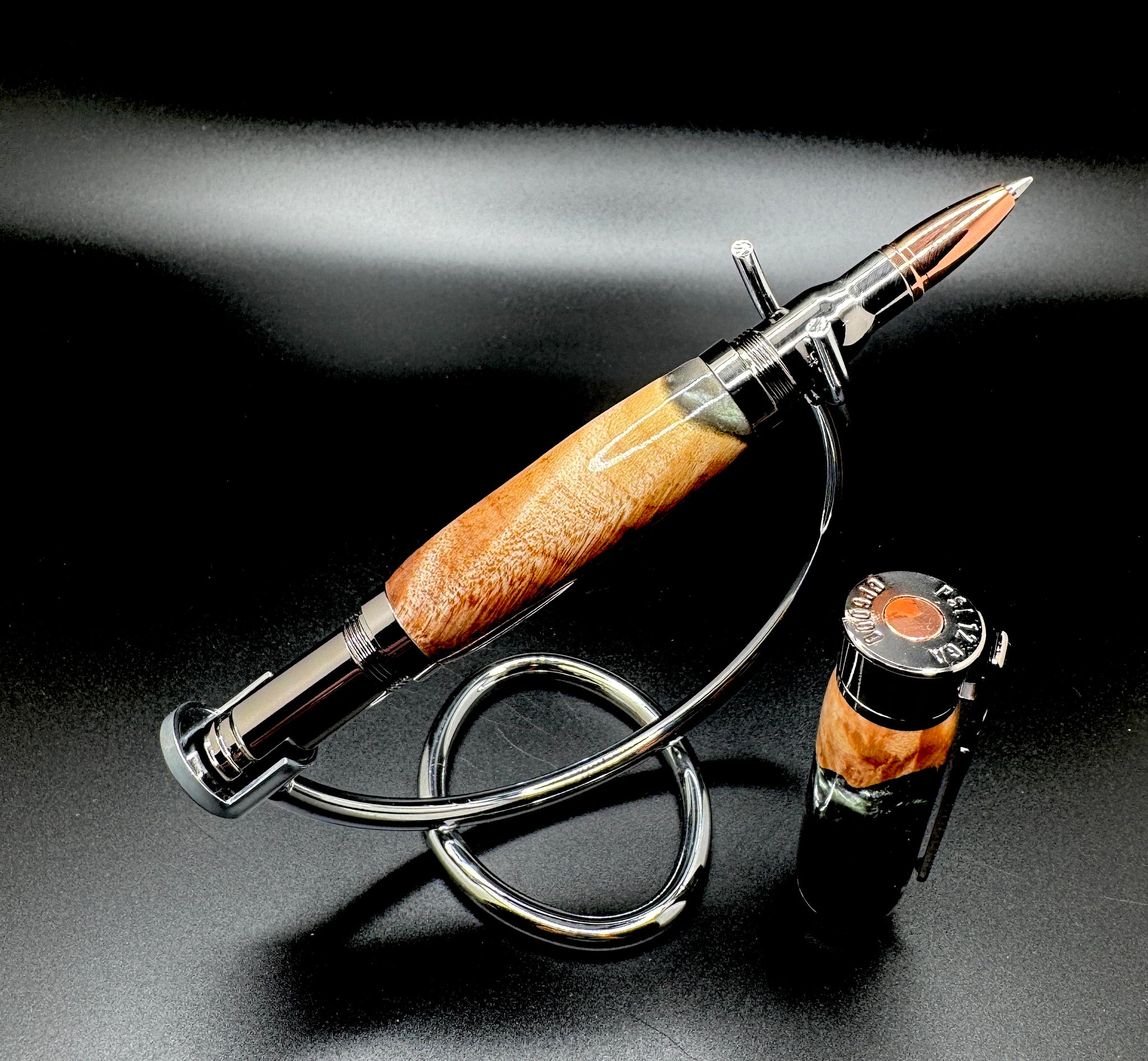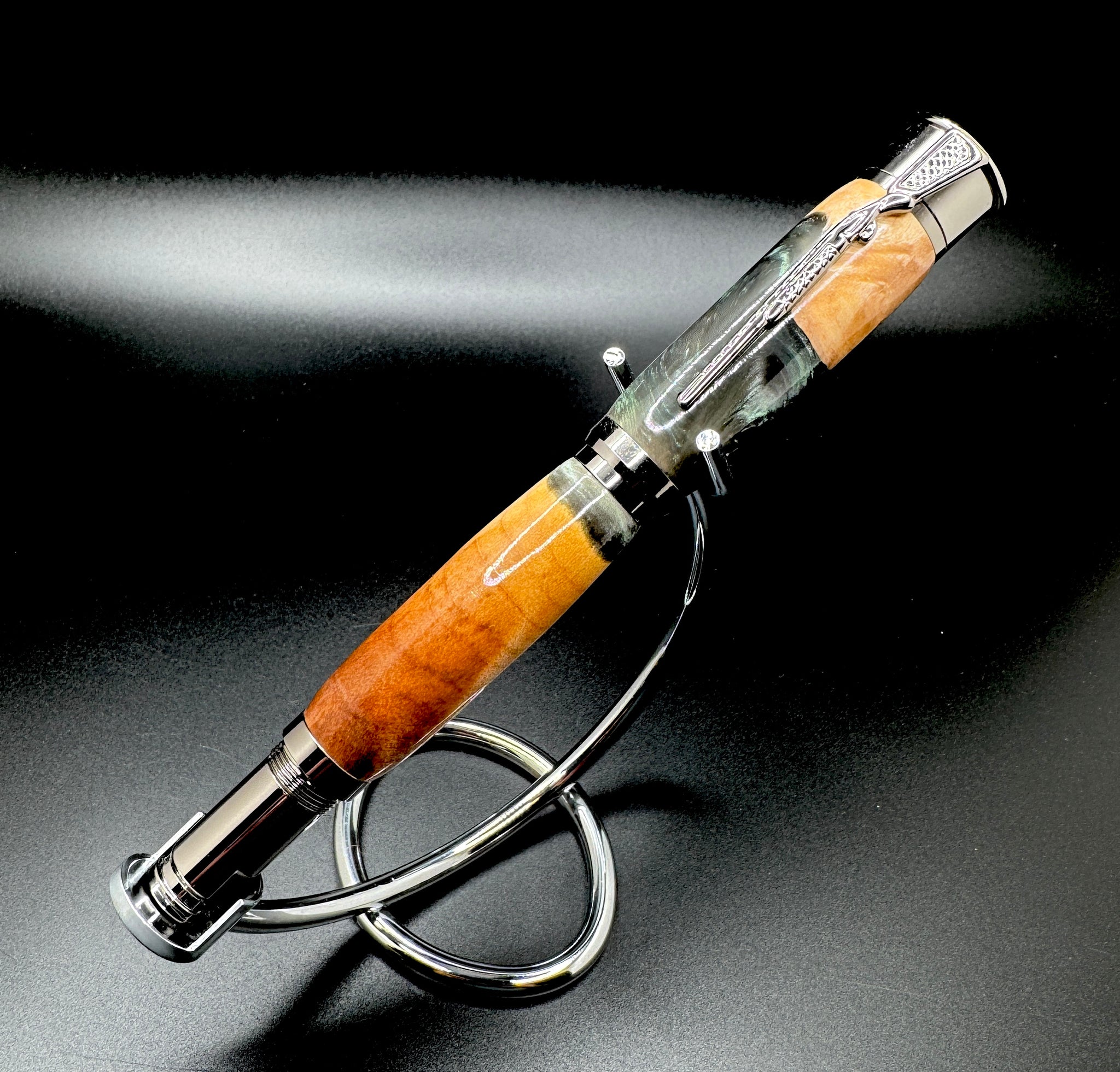 • The pen body consists of Maple burl paired with a greyish metallic Alumilite resin.