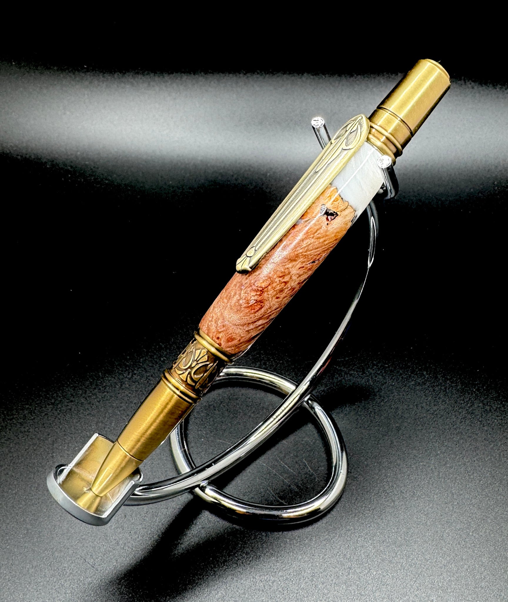 Stabilized maple burl paired with pearl white Alumilite resin.